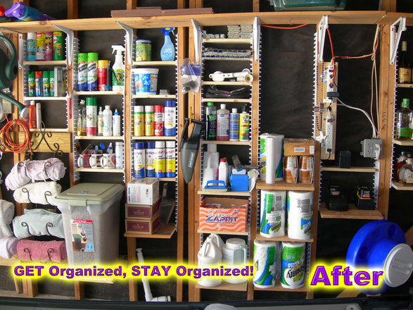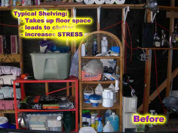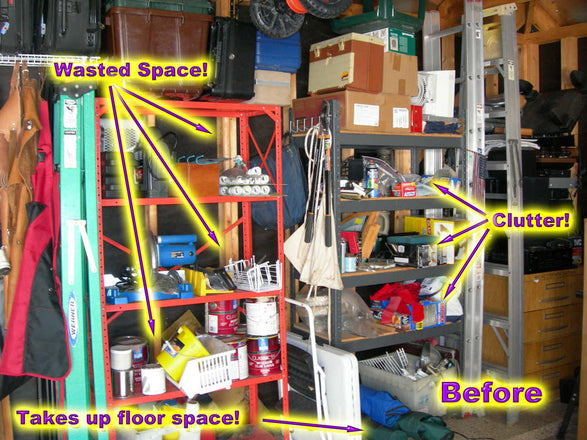 Here is another example of a cluttered fixed shelf. Another set of 56 EZStudRacks were ordered to organized the other half of the garage.