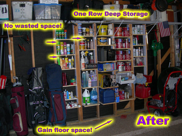 Remember, you can use 1×4’s, 1×6’s, 1×8’s, etc. to create custom storage. One Row DEEP Storage Helps you GET Organized and STAY Organized! Click to enlarge.