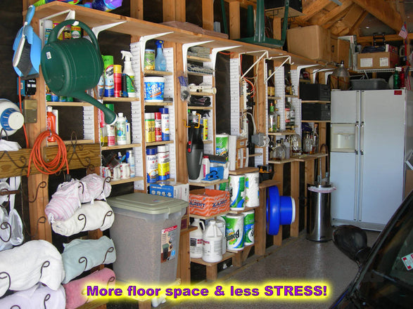 INFO: 56 EZStudRacks (7 Packages) were used to create this Organized Exposed Stud Garage. ONE ROW DEEP STORAGE helps you easily see what you have. Click to see larger picture.