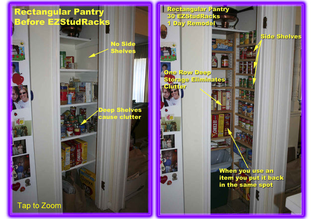 Here is a before and after picture of a rectangular pantry. It took one day to remodel this pantry prior to painting! 30 EZStudRacks were used.